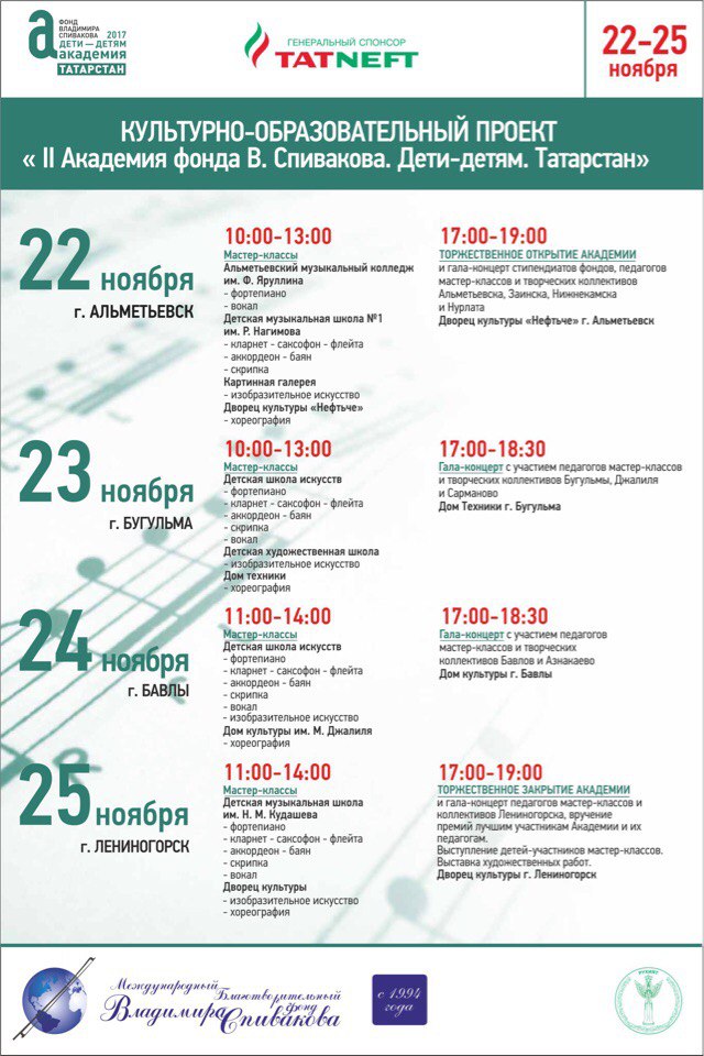 24 ноября в Бавлах, в рамках программы культурно-образовательного проекта «Академия фонда Владимира Спивакова. Дети-детям. Татарстан» пройдут мастер-классы по специальностям: фортепиано, вокал, кларнет-саксофон-флейта, аккордеон-баян, скрипка, изобразительное искусство, хореография с участием преподавателей фонда Владимира Спивакова, известных исполнителей, деятелей культуры.
