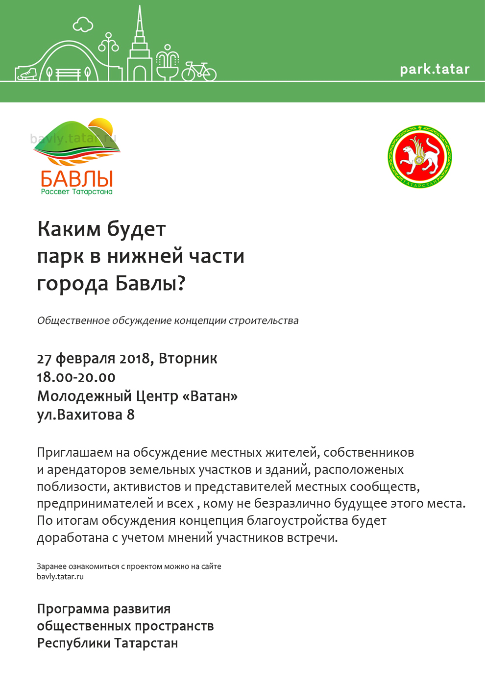 27 февраля 2018 года в Бавлах пройдет проектный семинар, посвященный обсуждению строительства парка в нижней части города Бавлы по программе Развития общественных пространств в Республике Татарстан.