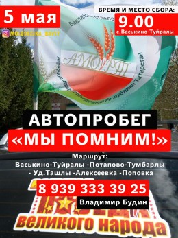 5 мая в бавлинском районе пройдет традиционный автопробег " Мы помним!", посвящённый 73 годовщине Победы в Великой Отечественной войне. Организатор пробега - Бавлинское отделение" Аграрное Молодежное объединение РТ". Маршрут автопробега: села Васькино- Туйралы - Потапово-Тумбарлы - Удмуртские Ташлы - Алексеевка - Поповка.