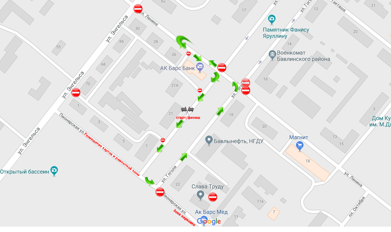Руководителем Бавлинского горисполкома подписано распоряжение о временном прекращении движения транспортных средств в связи с проведением открытых соревнований по картингу 14 октября 2018 года. В этот день с 7.00 до 15.00 будет прекращено движение транспорта по улице Гоголя (см.схему).