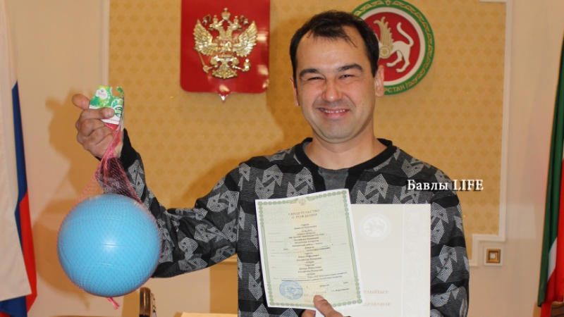 Начальник отдела ЗАГС Сирена Мурсалимова поздравила счастливого главу семейства Рената Рафилевича с рождением сына, вручила первый документ новорожденного – свидетельство о рождении, поздравительный адрес от Президента Республики Татарстан Р.Н.Минниханова и символический подарок – мячик для «футбольной команды».
