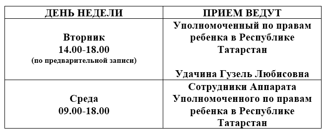 Запись на прием к Уполномоченному по правам ребенка в Республике Татарстан осуществляется по телефону: