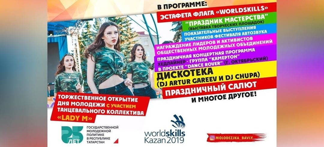18:20 - торжественное открытие Дня молодежи на городской площади с участием танцевального коллектива "Lady M". Награждение лидеров и активистов общественных молодежных объединений Бавлинского района.