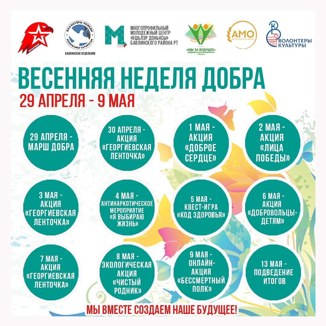 С 29 апреля по 9 мая в Бавлах пройдет ежегодная Всероссийская добровольческая акция «Весенняя неделя добра» под общим девизом «Мы вместе создаем наше будущее!».