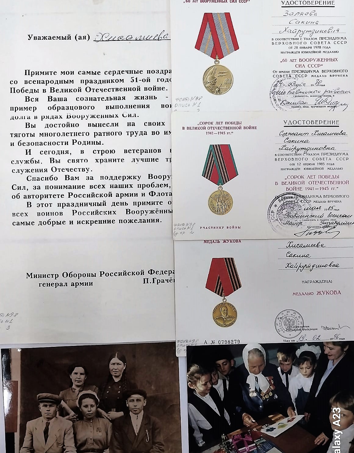 Хисамиева Сакина Хайрутдиновна, (1922-2017), добровольцом уходит на фронт в 1943 году. После 9-месячного обучения в г. Казани их отправляют в 1 Украинский фронт. Вначале была наводчицей, а потом ее назначили командиром отделения зенитчиц, присвоили звание сержанта. Участвовала в боях при освобождении Украины, Польши. День Победы Сакина Хайрутдиновна встретила в Польше.