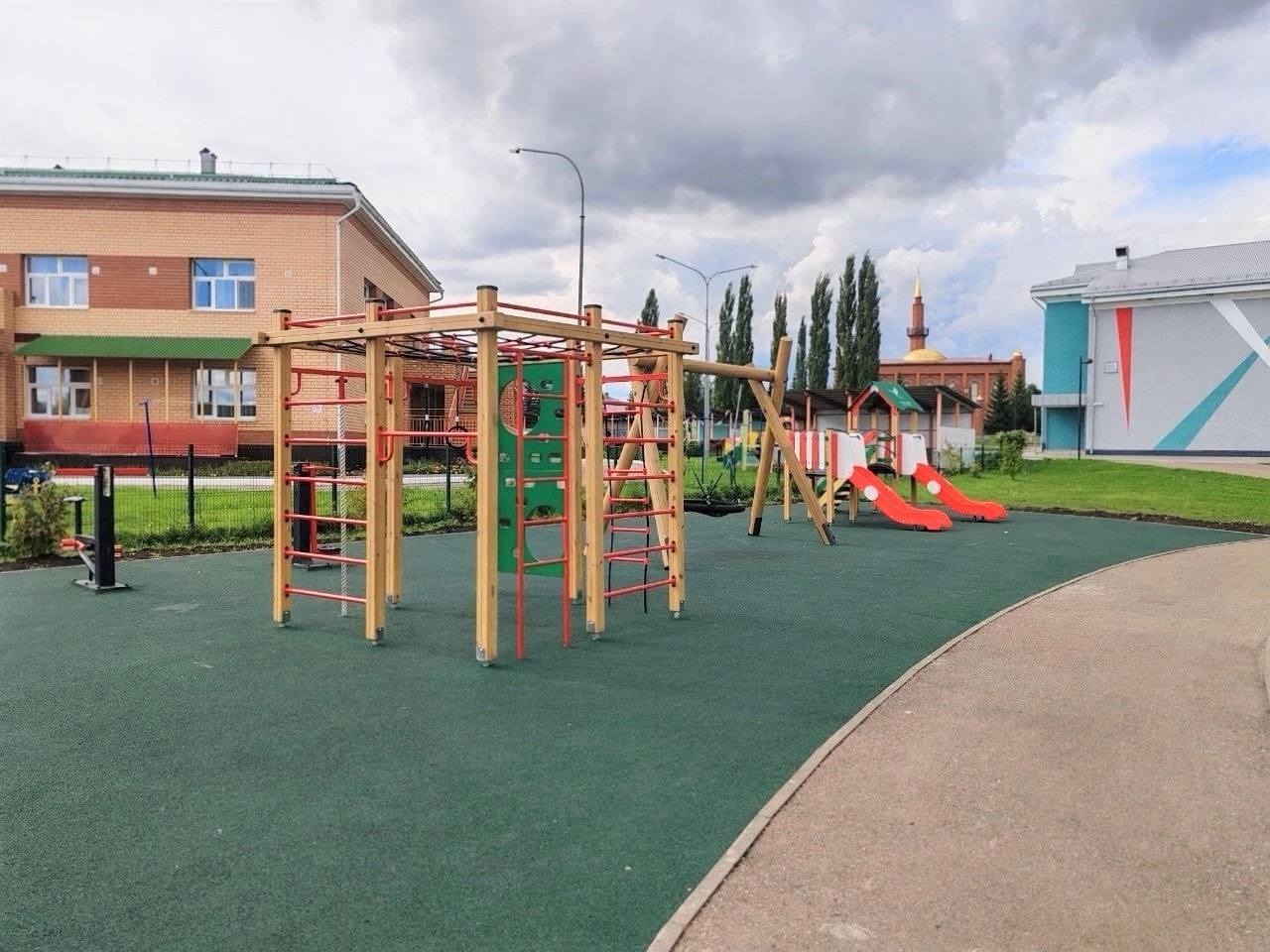 Игровое пространство с яркими горками, качелями, спортивными снарядами производства «Елховлес» находится рядом с молодёжным центром «Яшьлэр доньясы», детским садом «Колокольчик» и школой № 1.