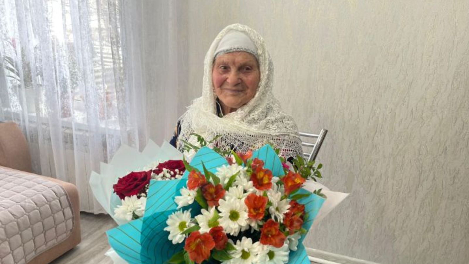 Газизә апа котлауларны шатланып кабул итте һәм кунакларны үзенең 100 яшьлек юбилеена көтәргә вәгъдә бирде.